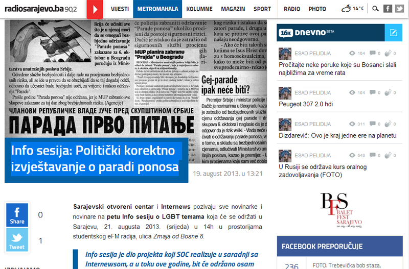 Radiosarajevo.ba, 19.08.2013. – Info sesija: Politički korektno izvještavanje o paradi ponosa