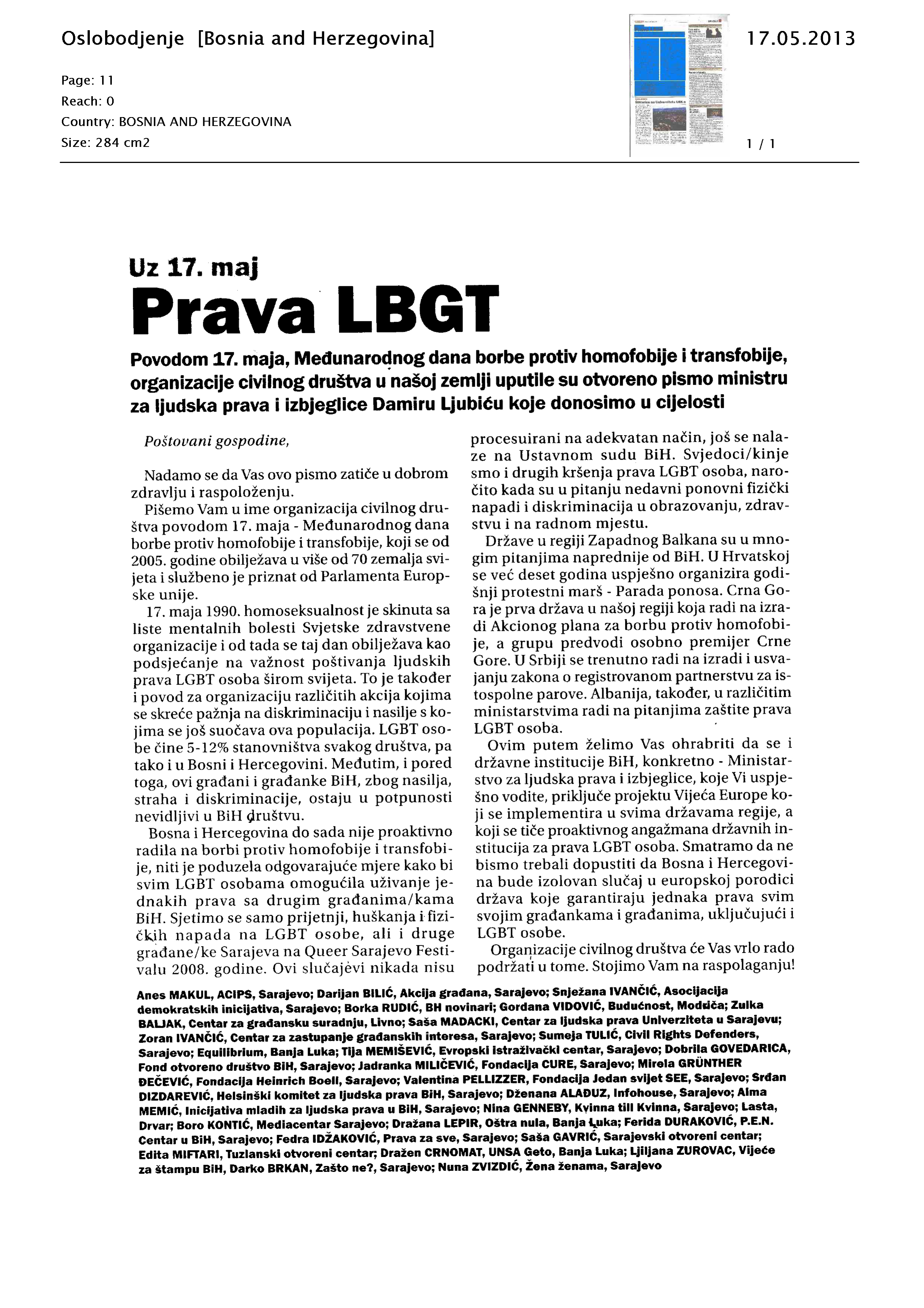 Oslobođenje, 17.05.2013. – Uz 17. maj prava LGBT