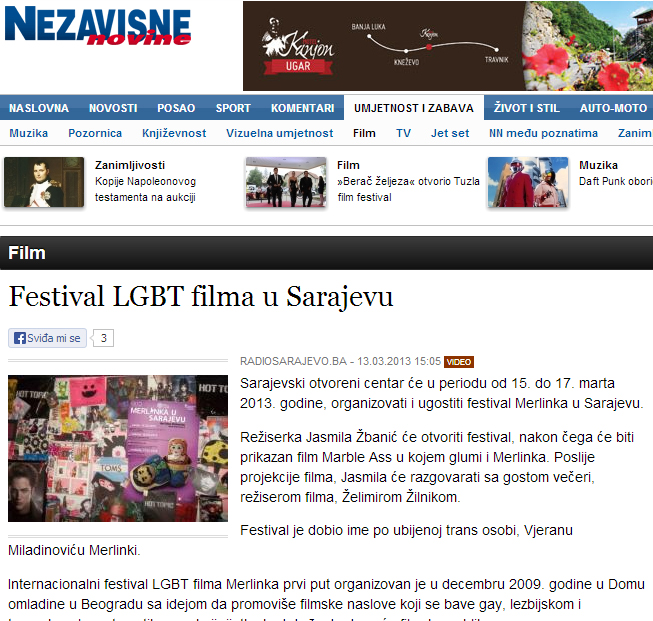 Nezavisne.com, 13.03.2013. – Festival LGBT filma u Sarajevu