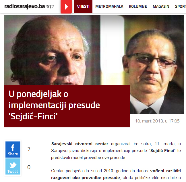 Radiosarajevo.ba, 10.03.2013. – U ponedjeljak o implementaciji presude ‘Sejdić-Finci’