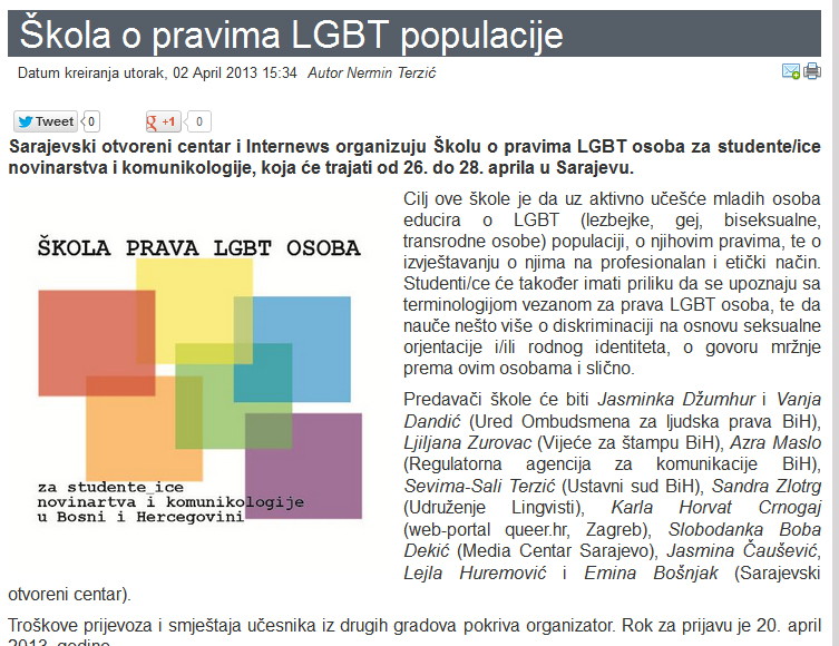 eTrafika.net, 02.04.2013. – Škola o pravima LGBT populacije