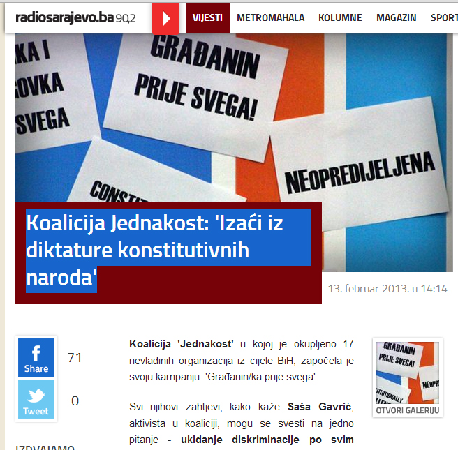 Radiosarajevo.ba, 13.02.2013. – Koalicija Jednakost: ‘Izaći iz diktature konstitutivnih naroda’