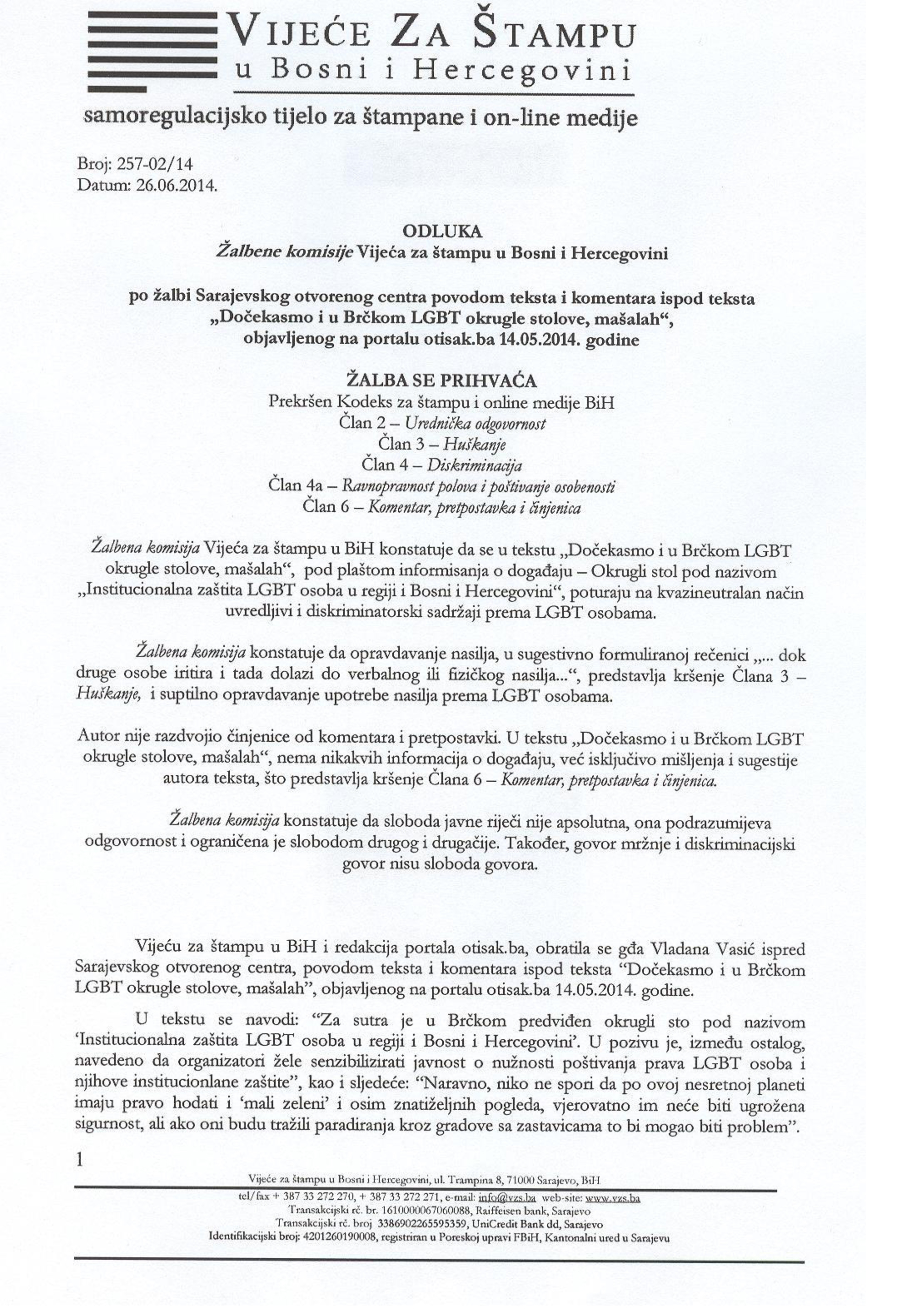 Žalbena komisija Vijeća za štampu u BiH, na sjednici održanoj 26.06.2014. godine, razmotrila je žalbu Sarajevskog otvorenog centra i utvrdila kršenje Kodeksa za štampu i...